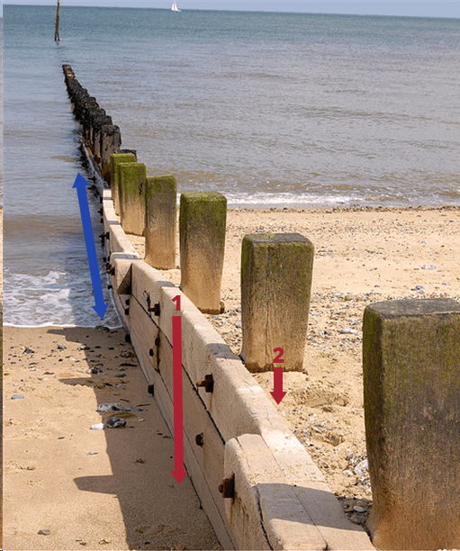 Compare the beach profiles on either side of the groyne. Think about the depth of sediment (the red arrows) as well as the position of the water line (blue arrow).